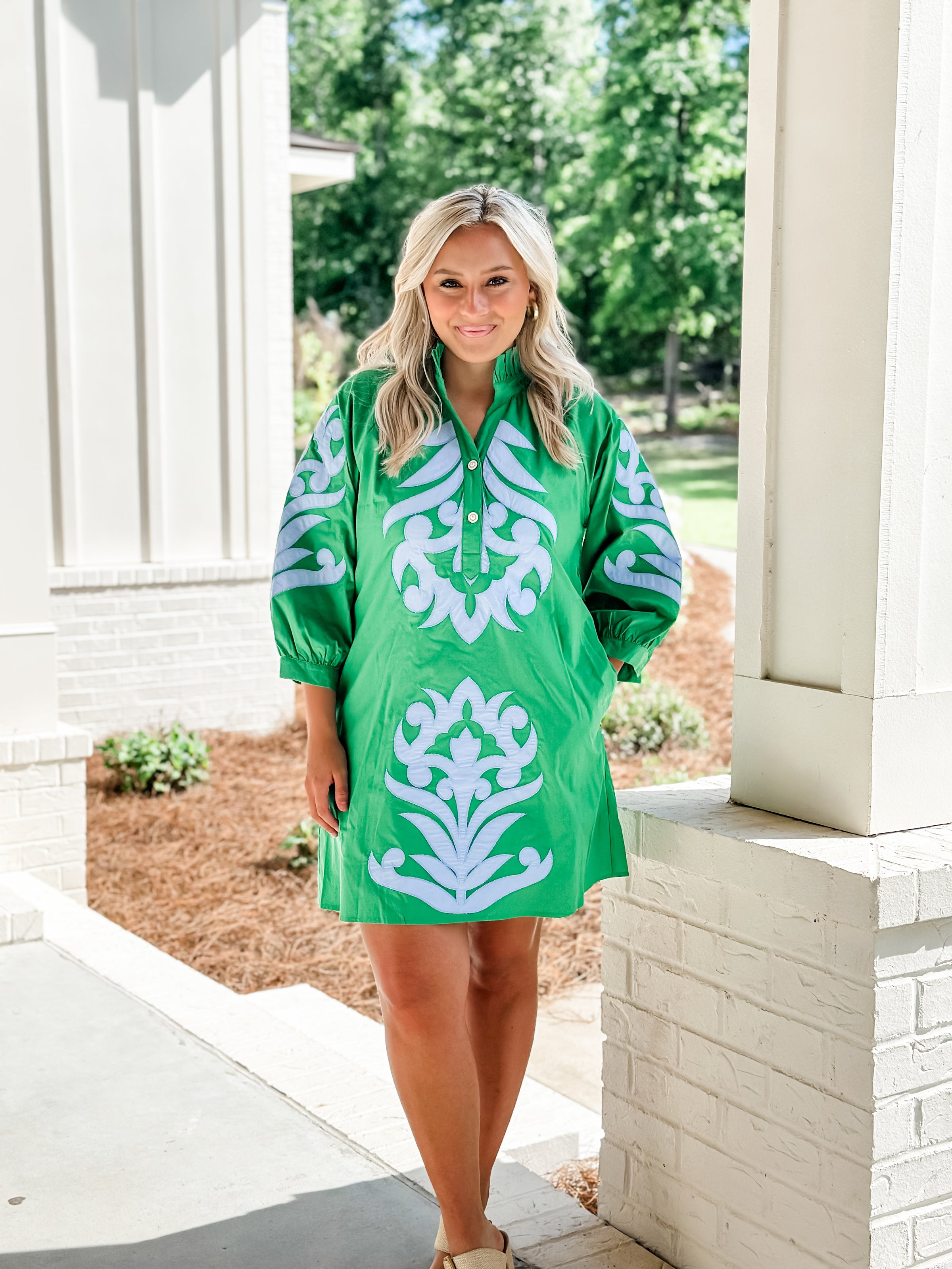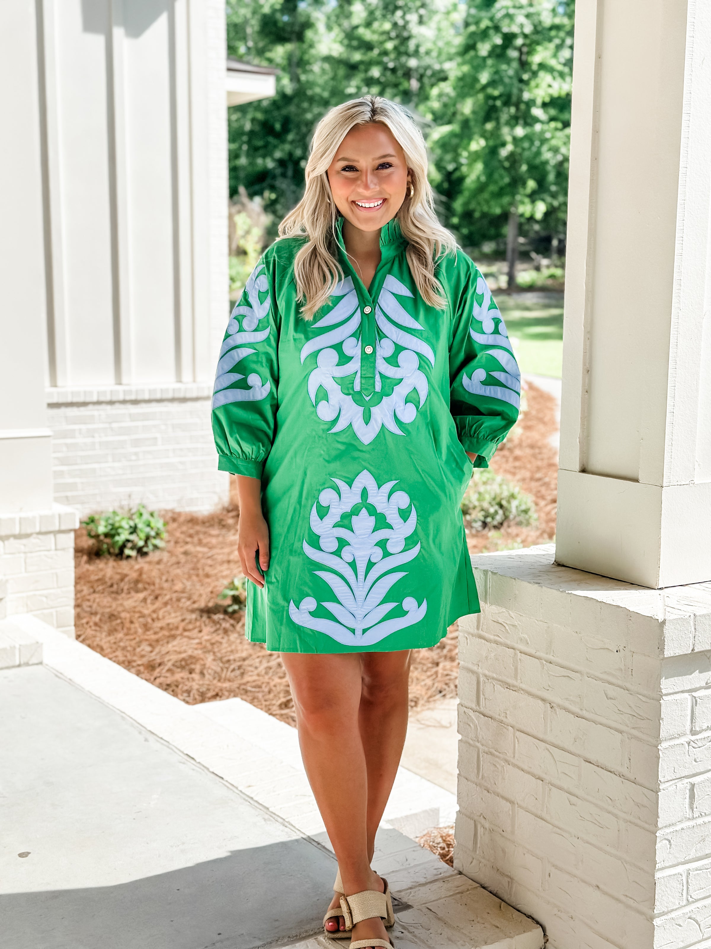 The Carolina Mini is a charming green dress designed for effortless style. Featuring a striking blue pattern on the front, this piece combines color and visual interest in one flattering silhouette. The three-quarter length sleeves offer a polished, versatile look that works across seasons, while the half button-up front adds a touch of casual elegance and easy layering options. Perfect for casual outings, weekend brunches, or dressed-up occasions with the right accessories.