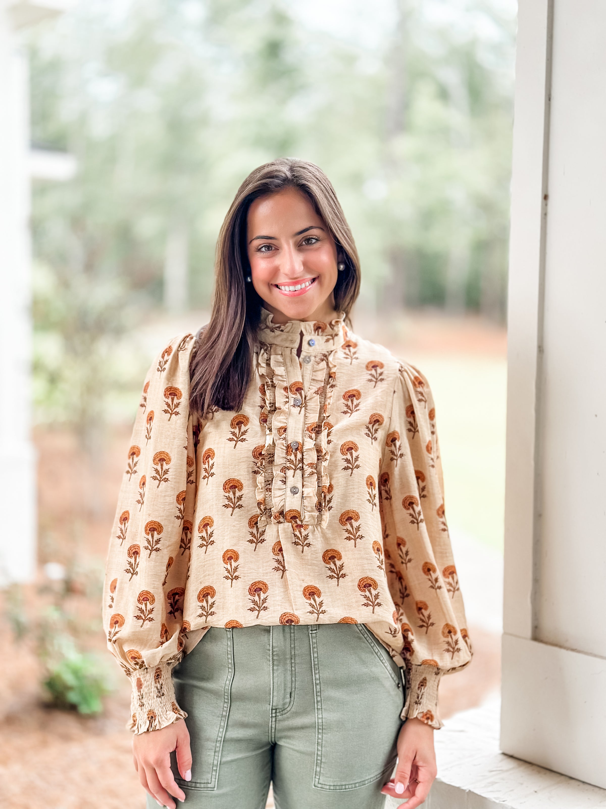 This light beige floral top, featuring playful ruffles and charming buttons down the front, brings a fresh, feminine touch to any outfit. Its delicate design makes it perfect for cozy coffee dates or casual outings, combining comfort with a flirty vibe you'll love to wear again and again.