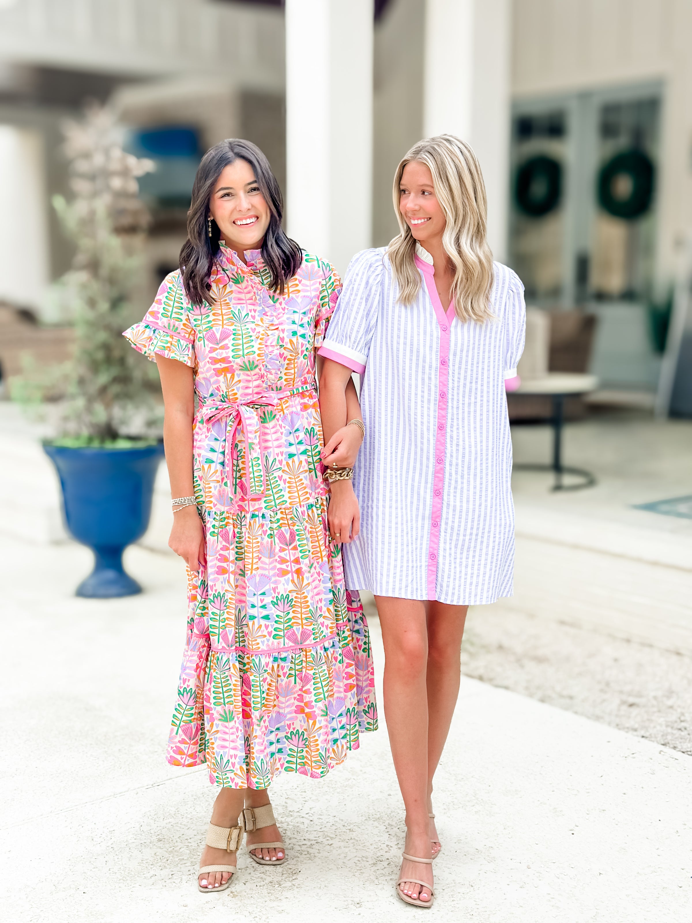 Embrace effortless elegance with this stunning maxi dress featuring vibrant floral patterns in a captivating color palette. The tie waist creates a flattering touch that defines you while allowing comfortable movement. Perfect for garden parties, weddings, or any occasion calling for graceful style, this piece transitions beautifully from day to evening wear.