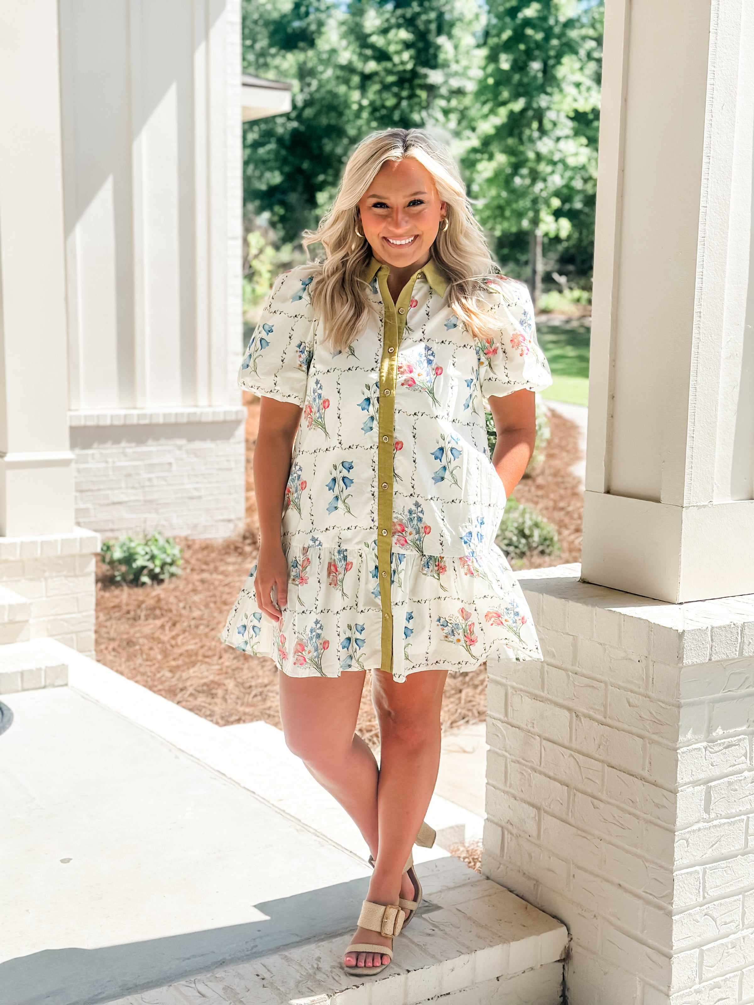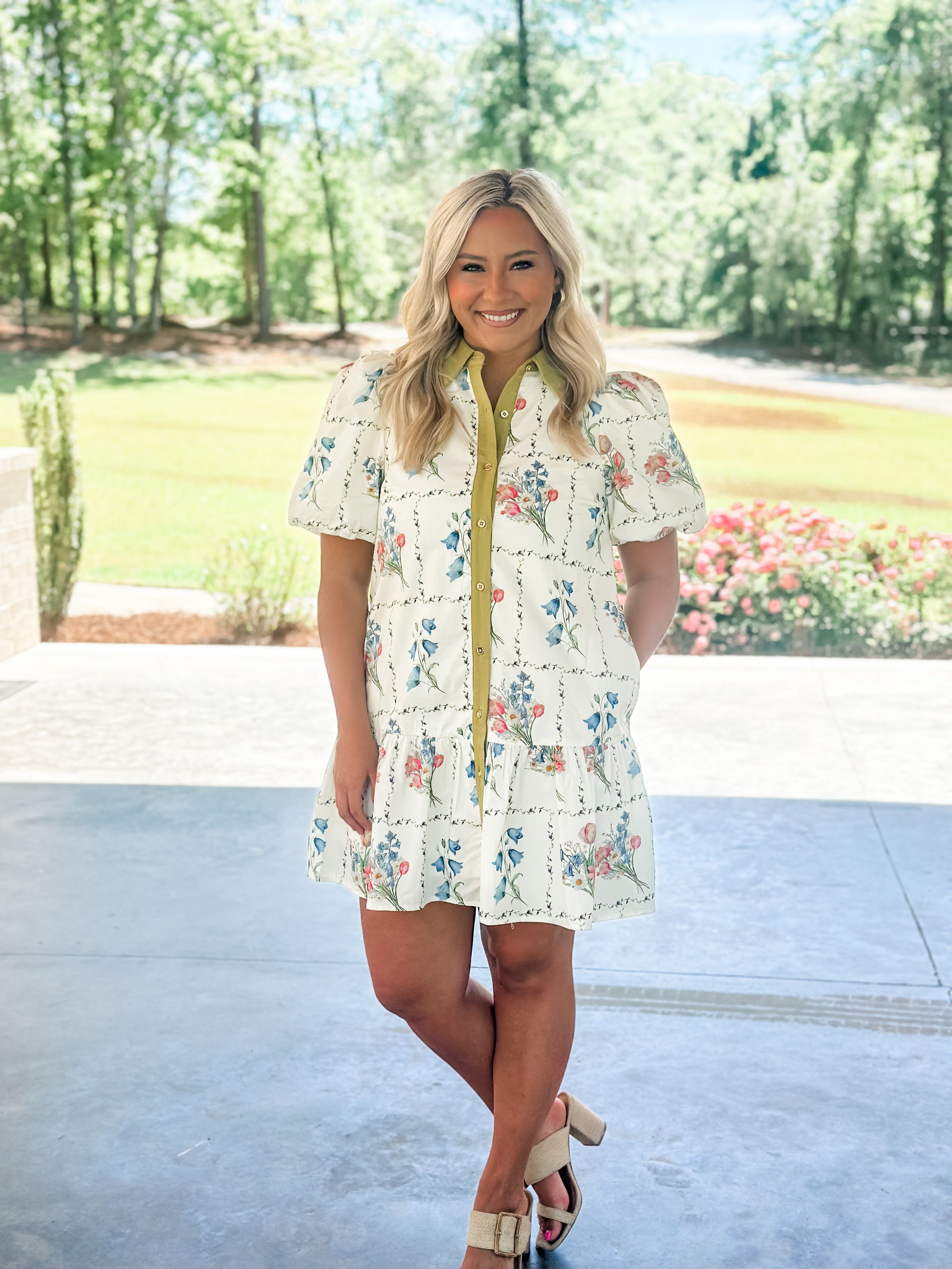 Effortless charm meets garden-inspired style in this delightful mini dress. Featuring a soft palette of white, blues, and blush florals, the dress is accented with a crisp green collar and front button closure for easy wear. Perfect for spring gatherings, casual outings, or any occasion calling for a touch of botanical beauty. The short sleeves and mini length offer a breezy, playful silhouette that transitions seamlessly from day to evening.