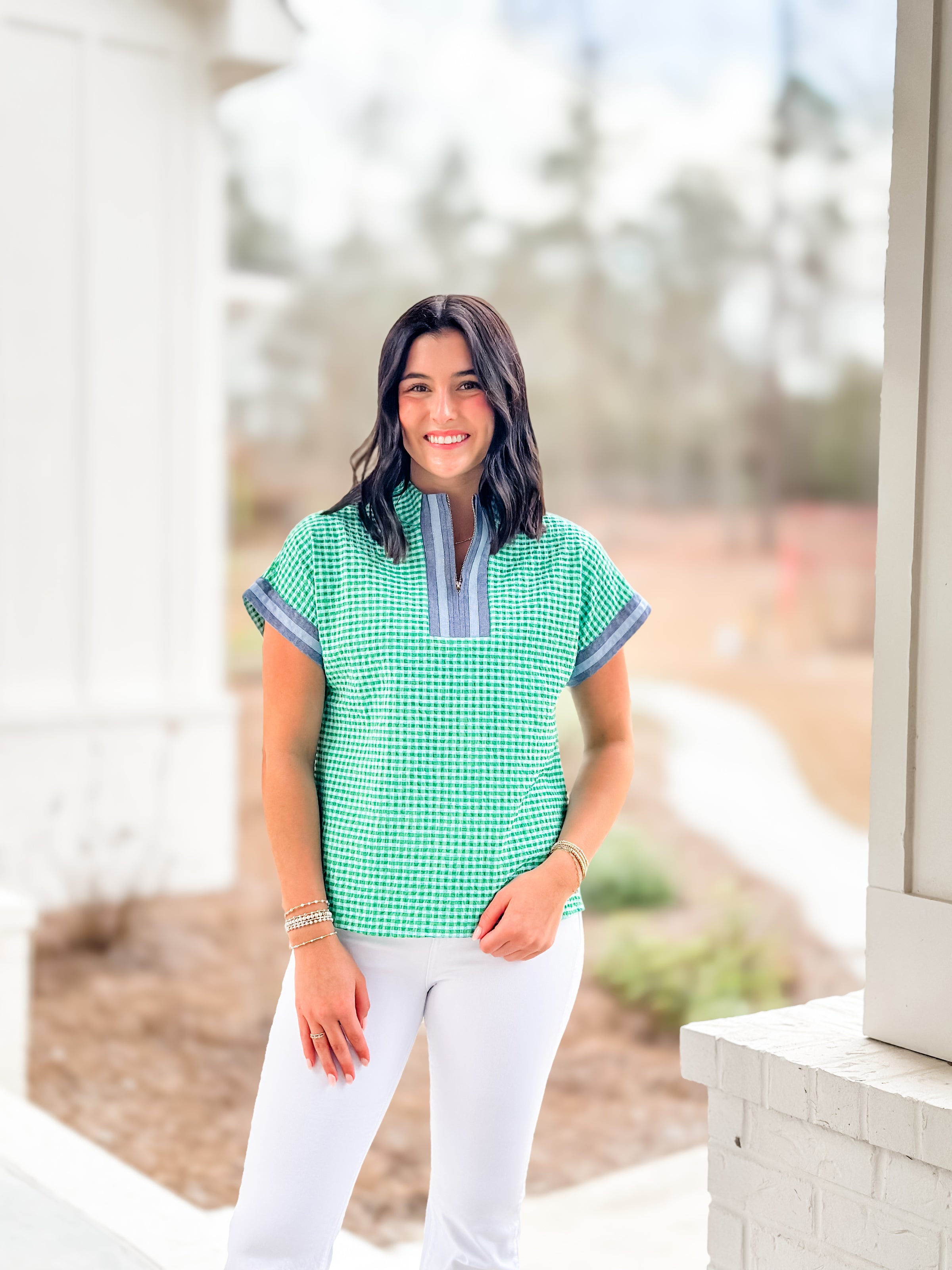 Brighten your casual wardrobe with this charming Gingham Zip Top! Featuring a cheerful blue and green checked print, this short-sleeve style combines preppy appeal with modern comfort. The quarter-zip neckline adds versatile layering options, while authentic denim detailing brings a touch of classic Americana. Perfect for weekend outings, casual brunches, or effortless everyday wear. Mix and match with your favorite denim or neutrals for endless styling possibilities.