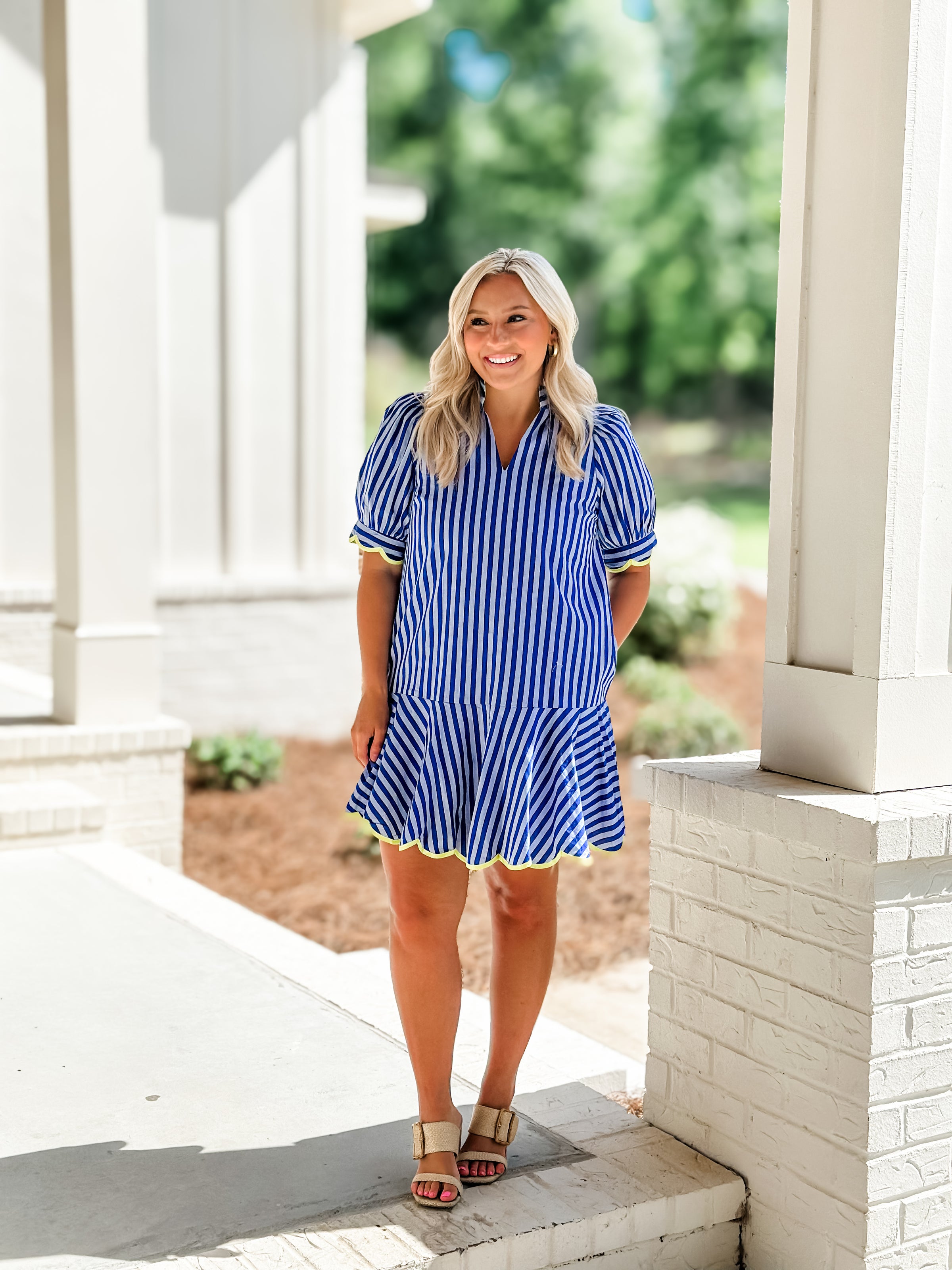The Iris Striped Mini Dress features a fresh color palette of light blue and navy stripes accented with vibrant green trim. This playful mini silhouette is perfect for warm-weather styling, offering a modern take on classic nautical inspiration. The contrasting stripes create visual interest while the green trim adds an unexpected pop of color. Ideal for casual outings, beach days, or dressed-up occasions with the right accessories.