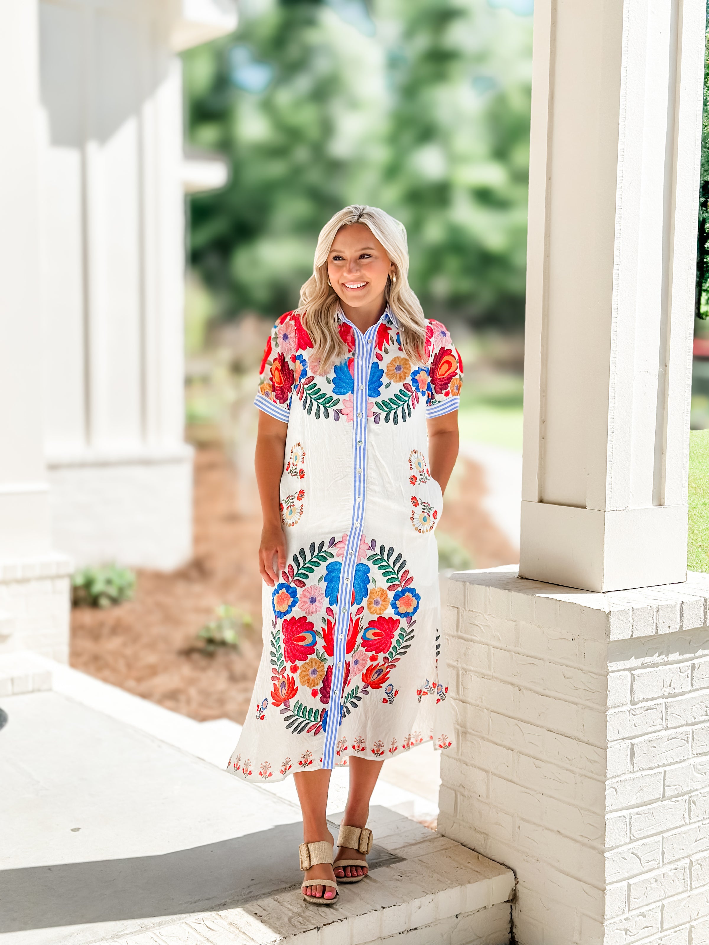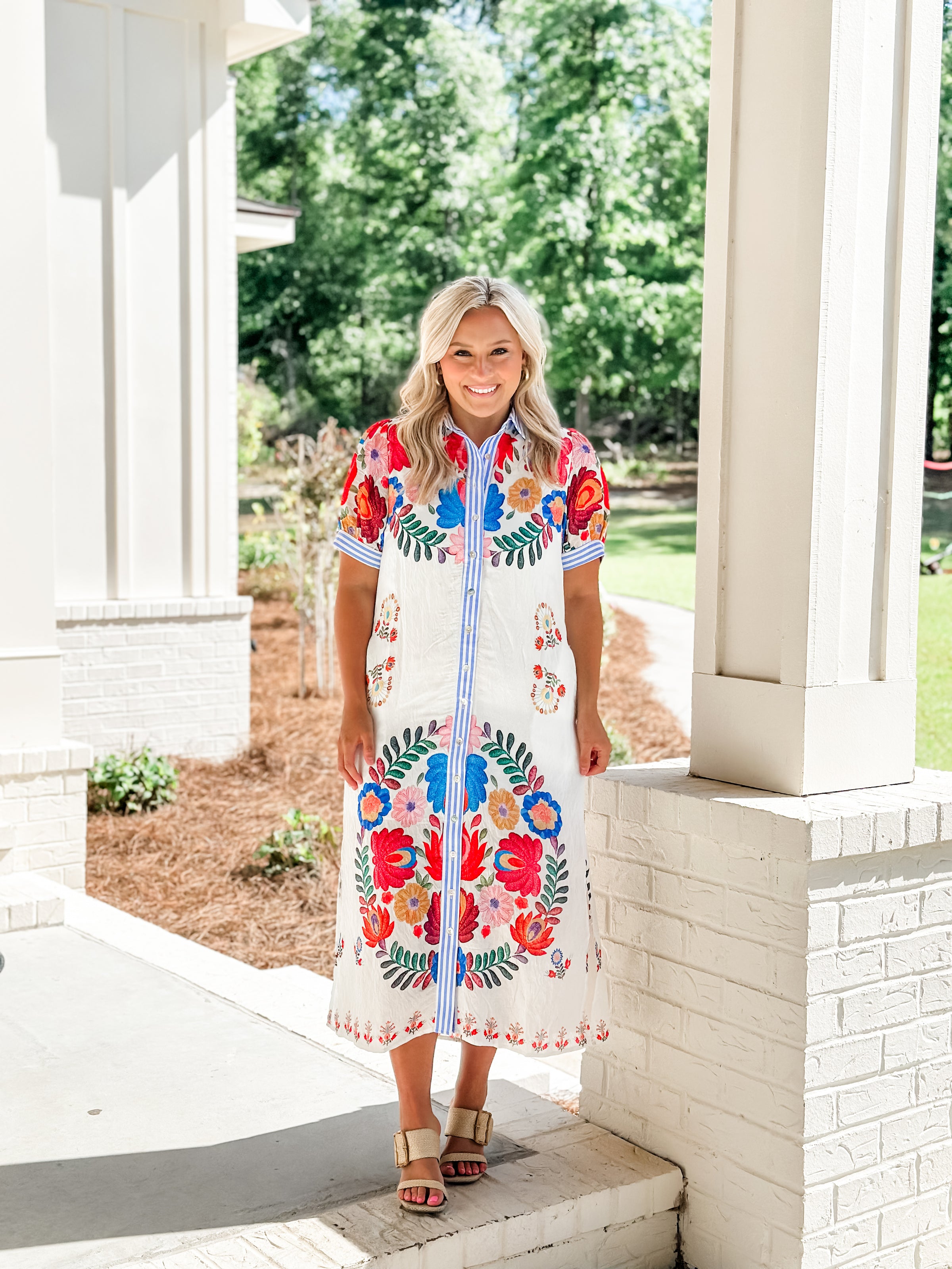 Effortless elegance meets vibrant style with the Maria Bloom Midi. This light, flowy dress features bold floral blooms that pop against a crisp striped collar and coordinating stripe trim along the front placket and sleeves. The button-down front adds a classic touch, making it easy to dress up or down. Perfect for warm-weather occasions, garden parties, or casual outings.