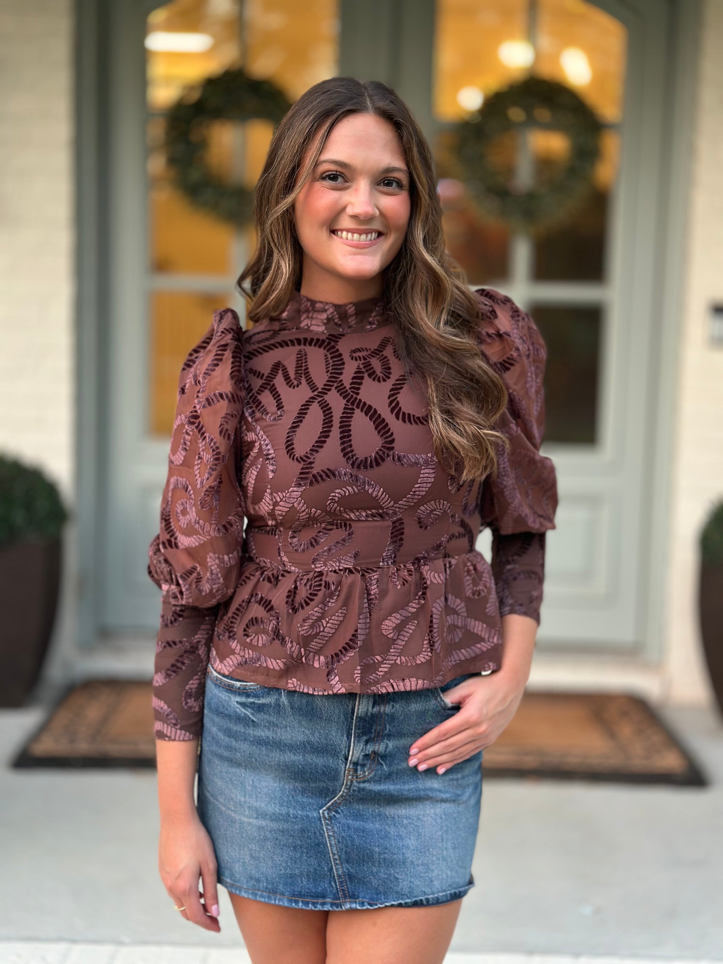 The Zoe Top in Rope is a striking blend of texture and silhouette, designed with voluminous puffed sleeves that taper into a slim fit for a dramatic yet wearable shape. A mock neckline, peplum hem, and back zip closure add polish to the feminine cut. The velvet rope motif spells out “JOY” across the fabric, a subtle nod to western-inspired detail that remains chic, unique, and elevated. Perfect for statement dressing, this top balances playful texture with timeless sophistication.
